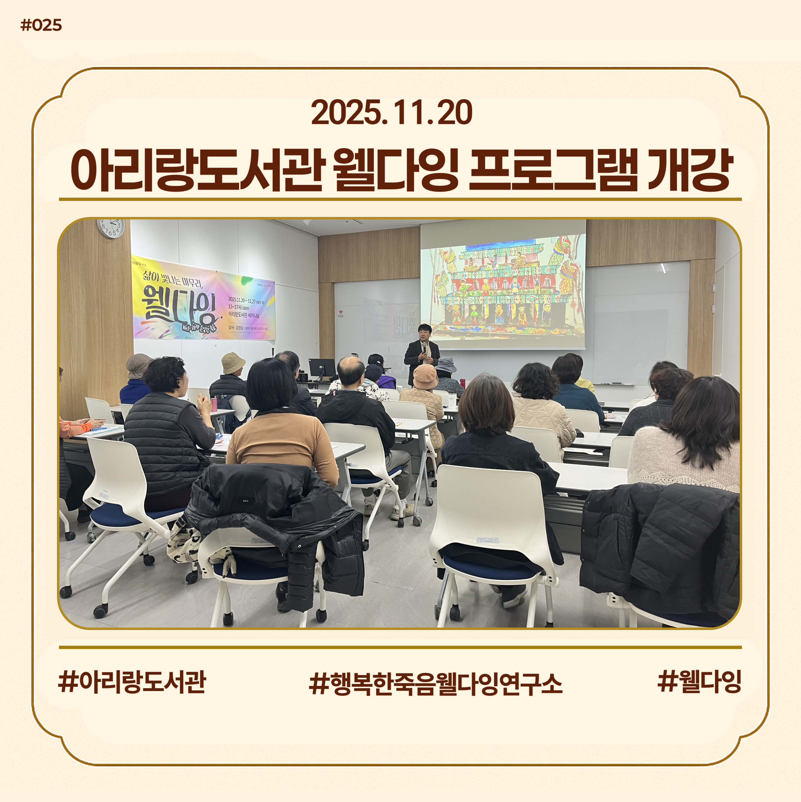 | 2025. 11. 26 관악구 보건소 의뢰 드림타운 아파트 경로당 웰다잉 특강 (0) | 2025.12.14 |
