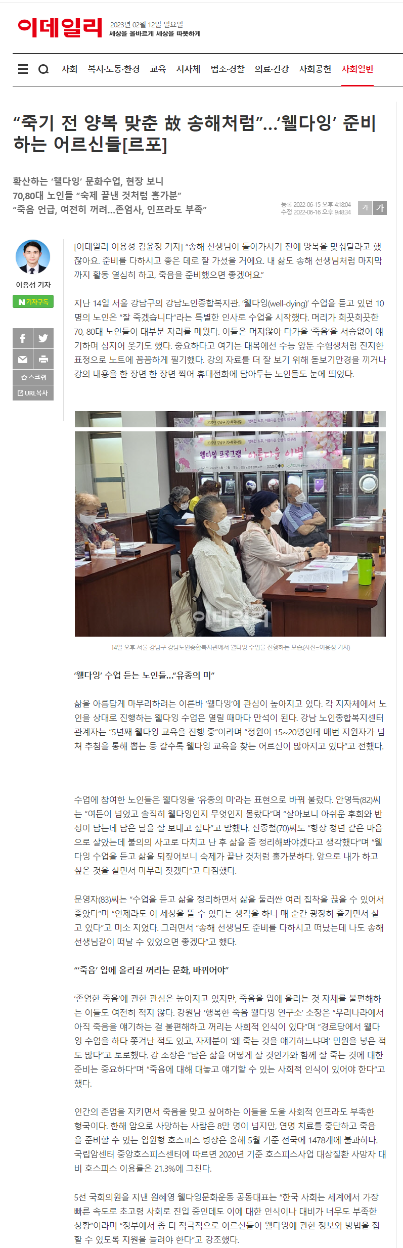 | [2021. 10 29 브라보 마이 라이프]"좋은 죽음 알리자"... 웰다잉 소개하는 노인복지관들 (0) | 2020.05.15 |