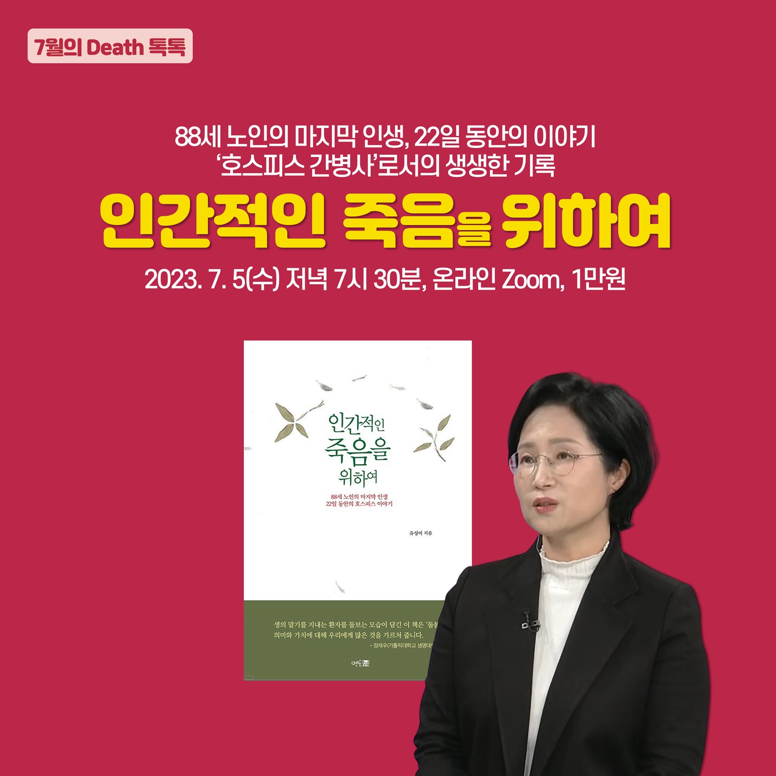 '괜찮아 엄마, 미안해 하지마', '인간적인 죽음을 위하여'를 저술하셨고 현재 가톨릭대학교에서 '생명윤리학' 박사 과정 중에 계신 유성이 작가님을 모시고 삶과 죽음을 함께 이야기 나누는 온라인 카톡방 Death 톡톡에서 7 Zoom 특강을 실시합니다.
