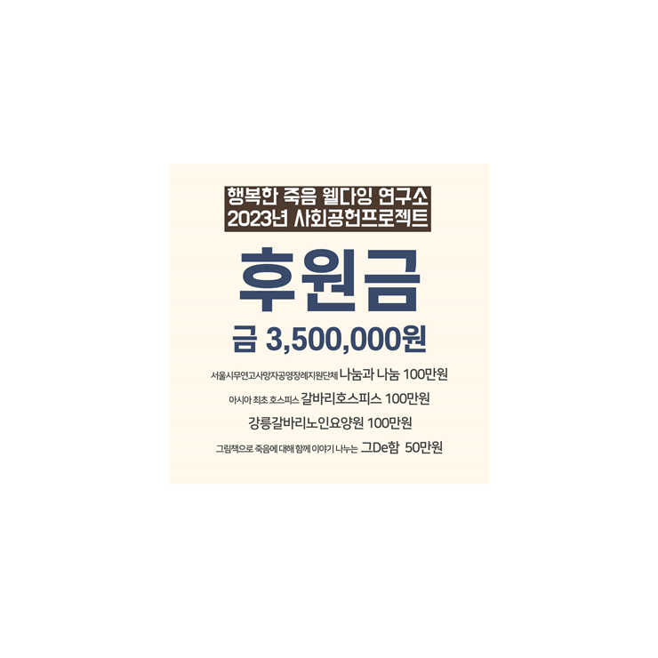 2014년 행복한 죽음 웰다잉 연구소를 개소하면서, 현장에서 뜻깊게 실천하시는 분들께 조금이라도 도움이 되자 다짐했습니다. 그리고 다행히 매년 행복한 웰다잉 학교를 진행하여 얻은 수익금을 후원할 수 있었습니다