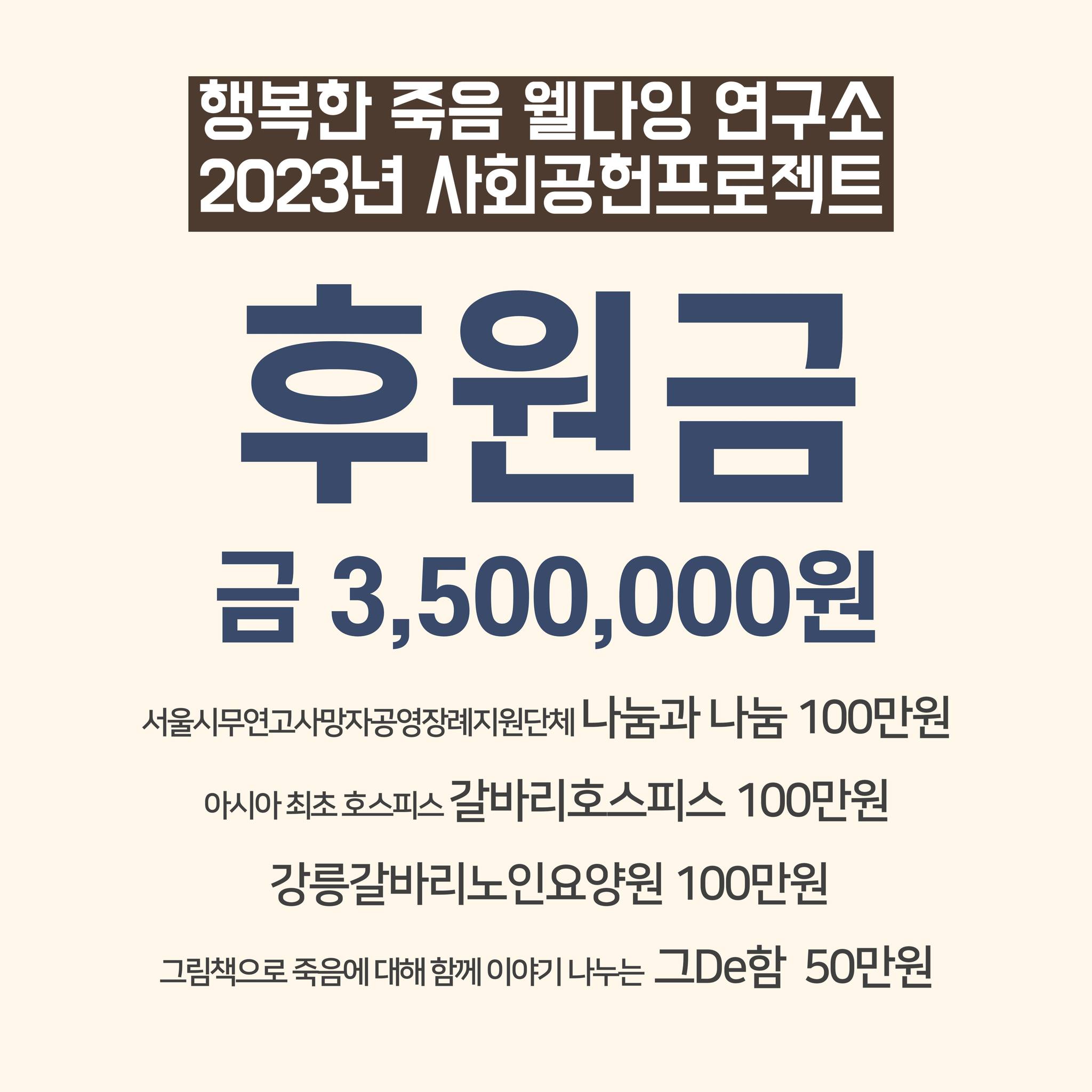 2014년 행복한 죽음 웰다잉 연구소를 개소하면서, 현장에서 뜻깊게 실천하시는 분들께 조금이라도 도움이 되자 다짐했습니다. 그리고 다행히 매년 행복한 웰다잉 학교를 진행하여 얻은 수익금을 후원할 수 있었습니다