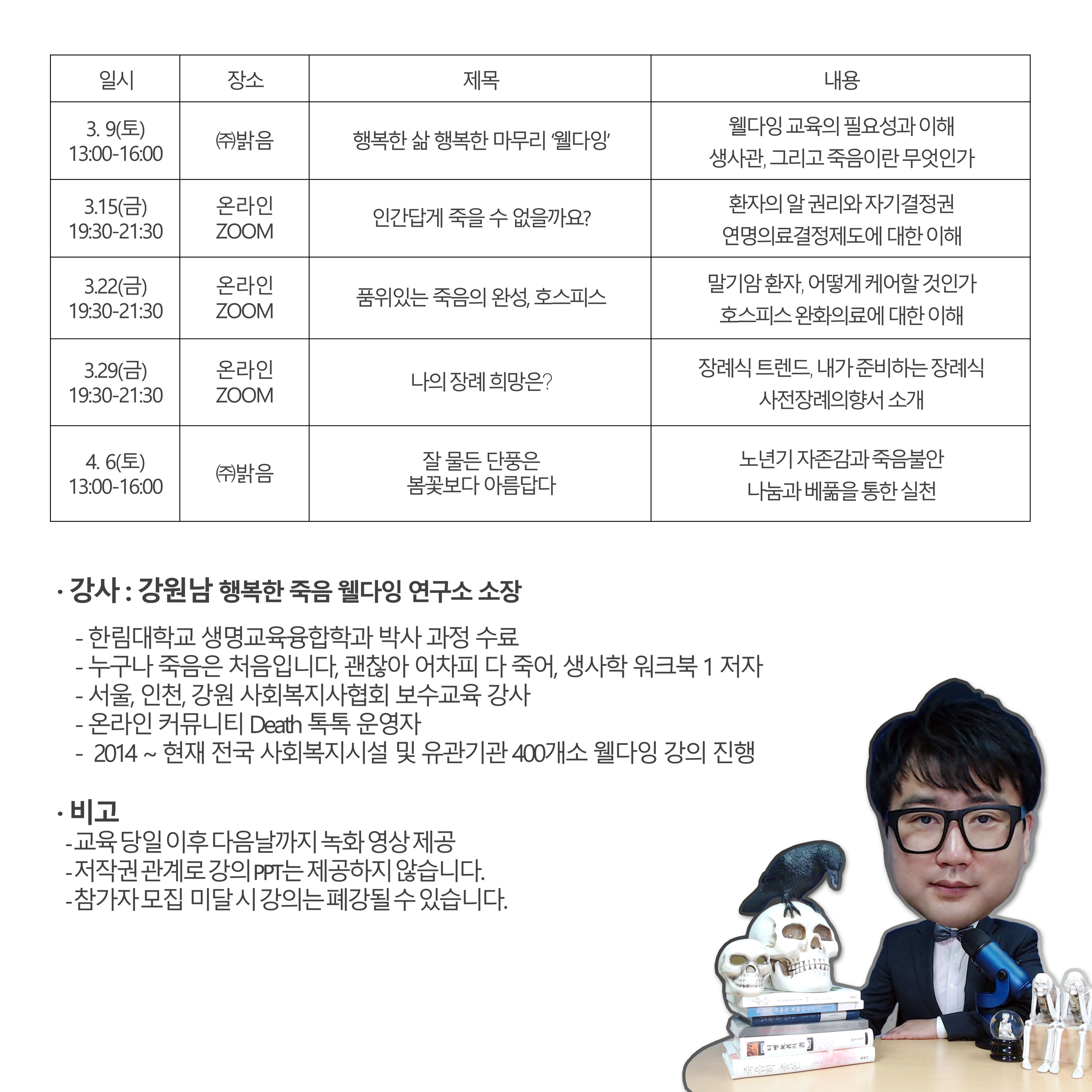- 1회기 3. 9(토) 13:00-16:00 (주)밝음: 행복한 삶 행복한 마무리 ‘웰다잉’ / 웰다잉 교육의 필요성과 이해, 생사관 그리고 죽음이란 무엇인가