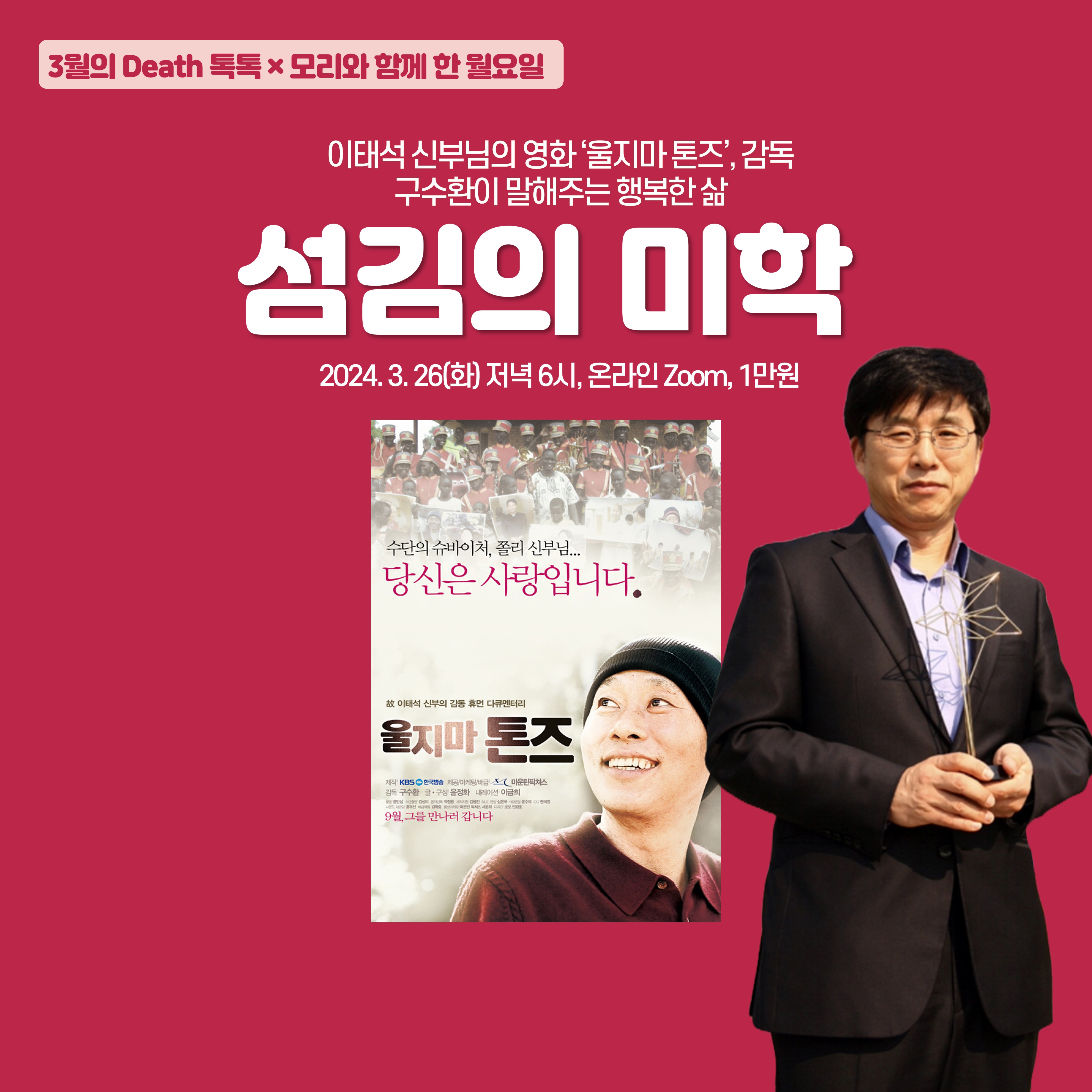| 2024년 1월 Death 톡톡 × 모리와 함께 한 월요일 '대통령의 염장이', 유재철 장례지도사님 온라인 특강 안내 (0) | 2024.01.14 |