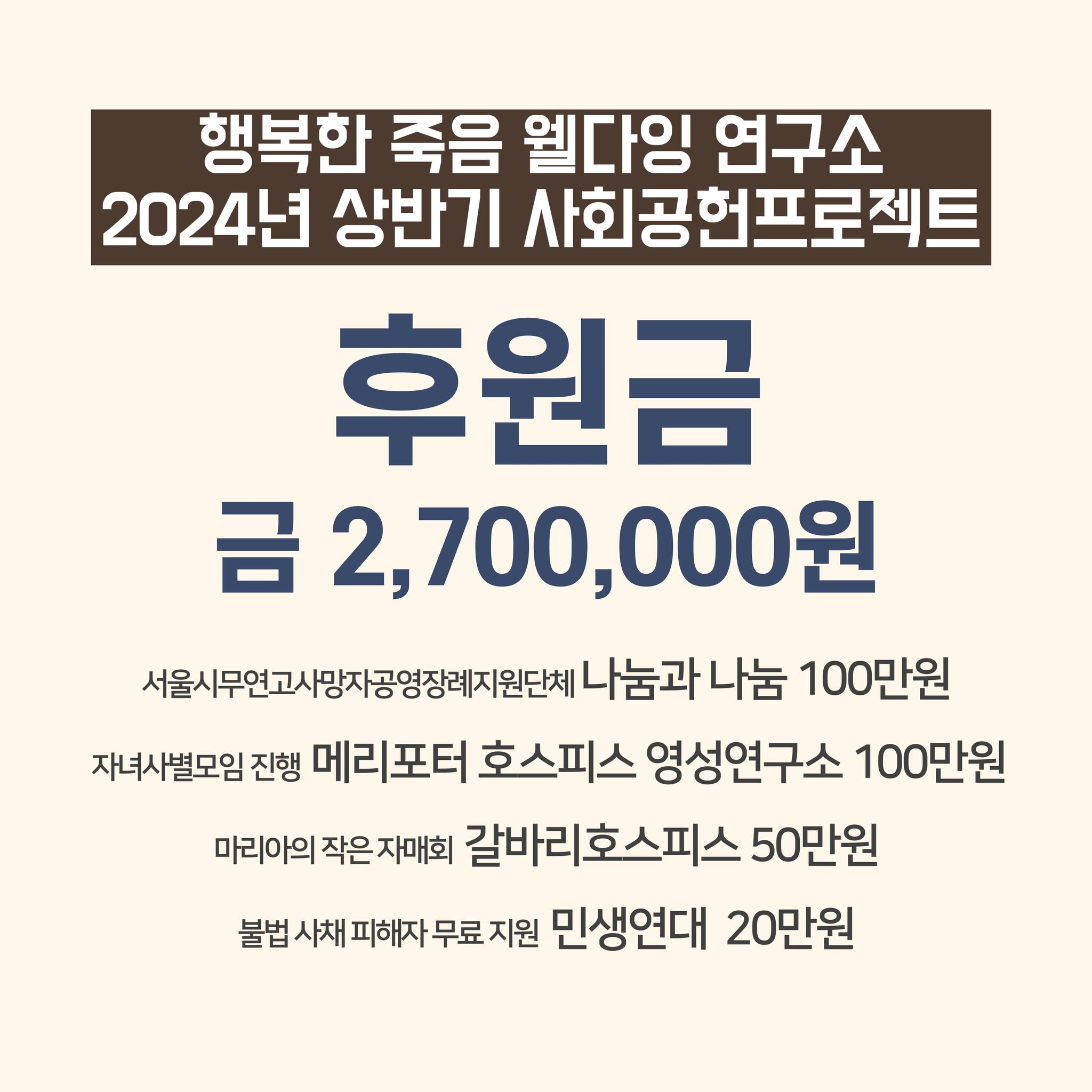 2024년 상반기 행복한 웰다잉 학교 수익금 전액을 네 곳의 단체에 전달했습니다.