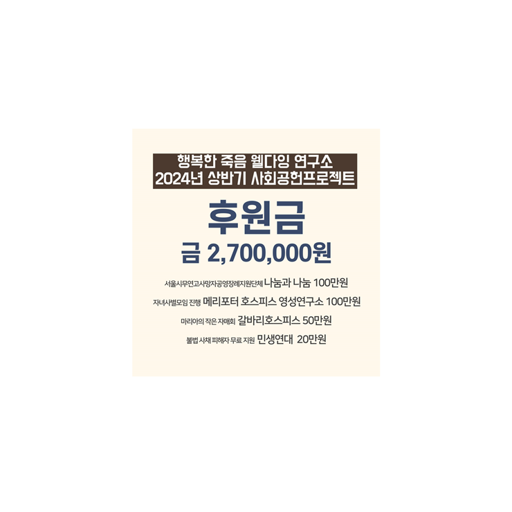 2014년 행복한 죽음 웰다잉 연구소를 개소하면서, 현장에서 뜻깊게 실천하시는 분들께 조금이라도 도움이 되자 다짐했습니다. 그리고 다행히 매년 행복한 웰다잉 학교를 진행하여 얻은 수익금을 후원할 수 있었습니다.